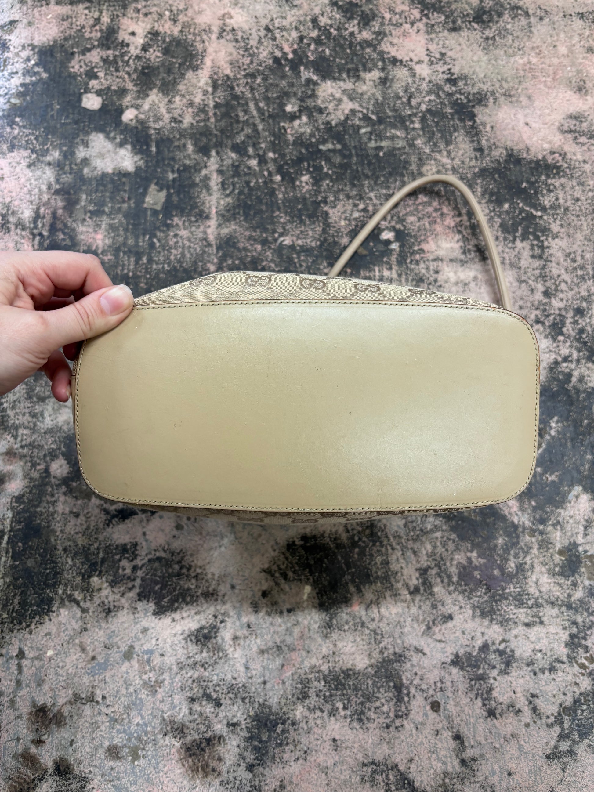 Authentic. 01234 205027. Length 9.25”. Depth 7.75”. Gucci shoulder bag with iconic monogram GG pattern in beige. Silver accents. Rolled shoulder straps with removable clasps. Flat base. Leather trim. Top zip closure. Brown lining. Interior zip pocket. Stylish and versatile for everyday use. Made in Italy. Dust bag included. Some marks on canvas & wear on strap, see photos. Good condition.