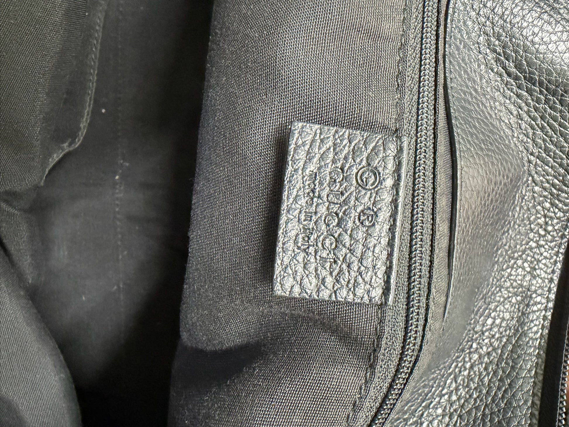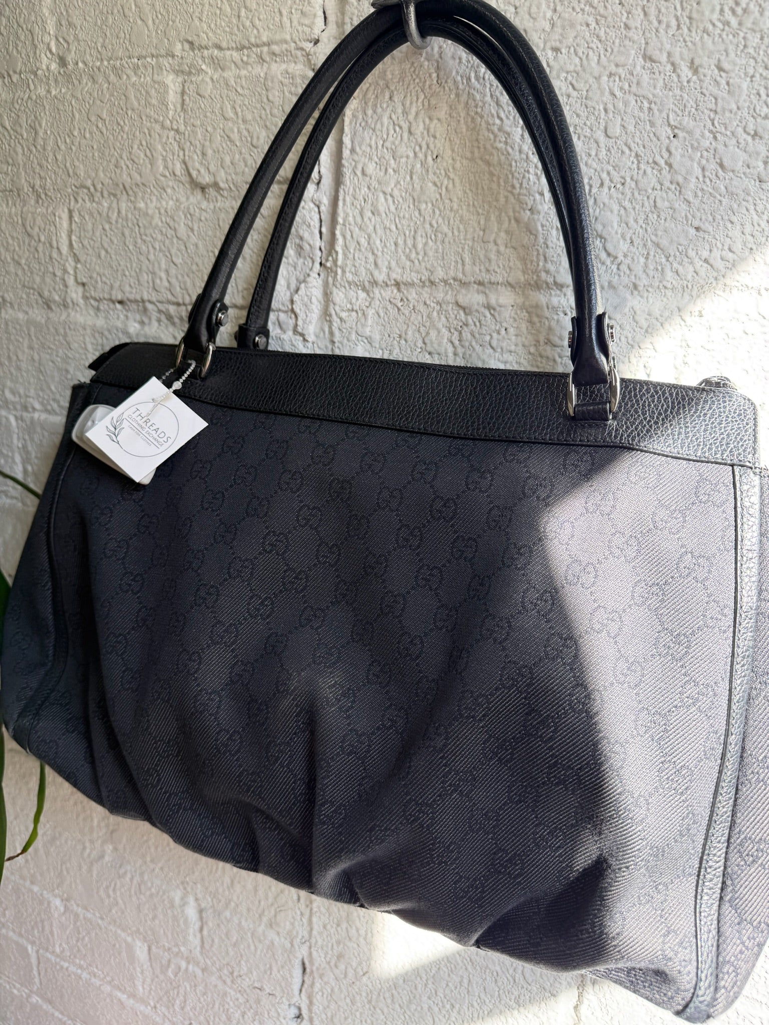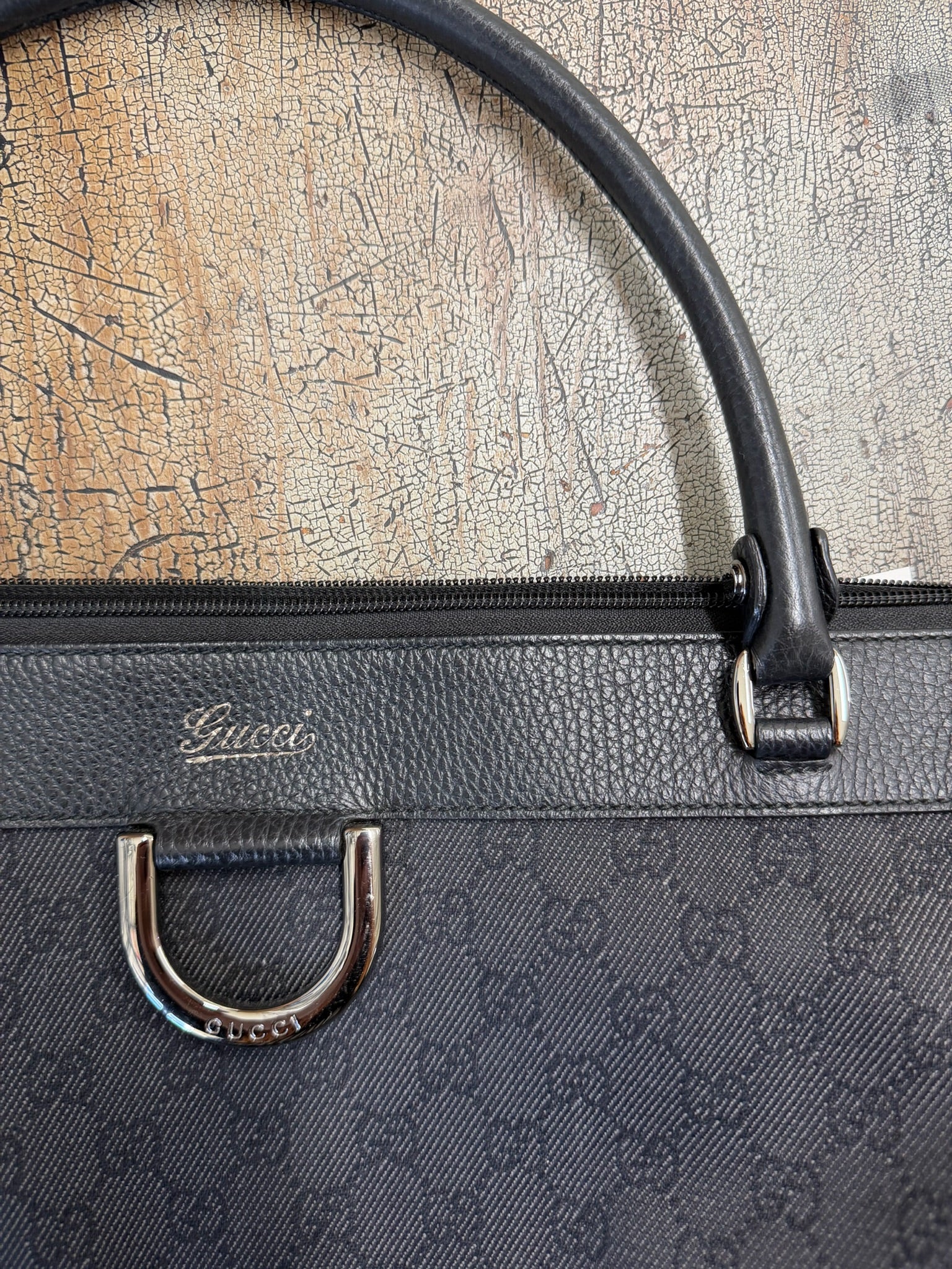 Authentic. 341491 002123. Length 16.5". Depth 9". Black GG denim canvas with leather trim. Gunmetal D-ring accent. Two top handles. Flat base with five metal feet. Top zip closure. Lined. Interior zip pocket, slip pocket. Made in Italy. Dustbag included. Good condition.