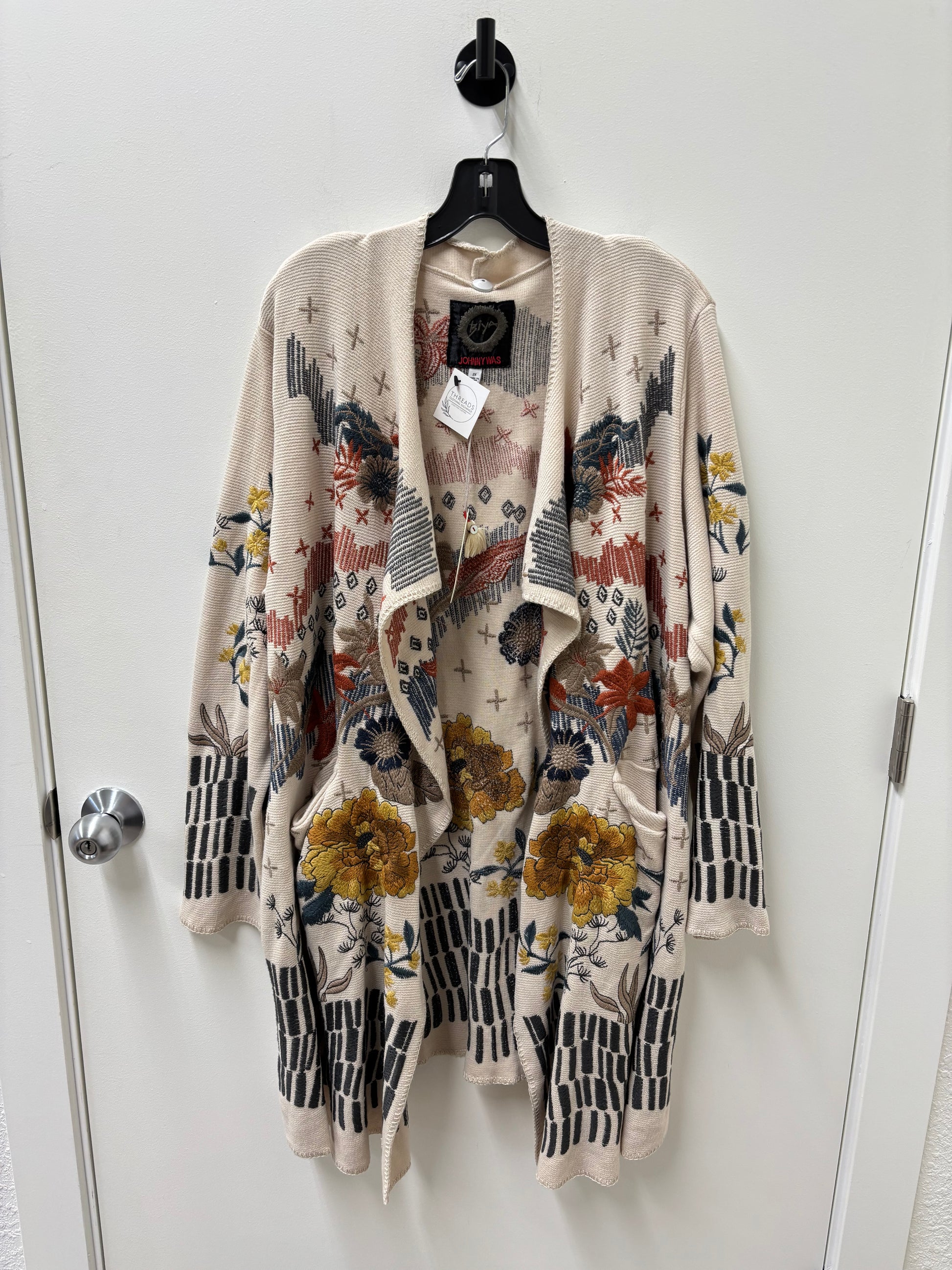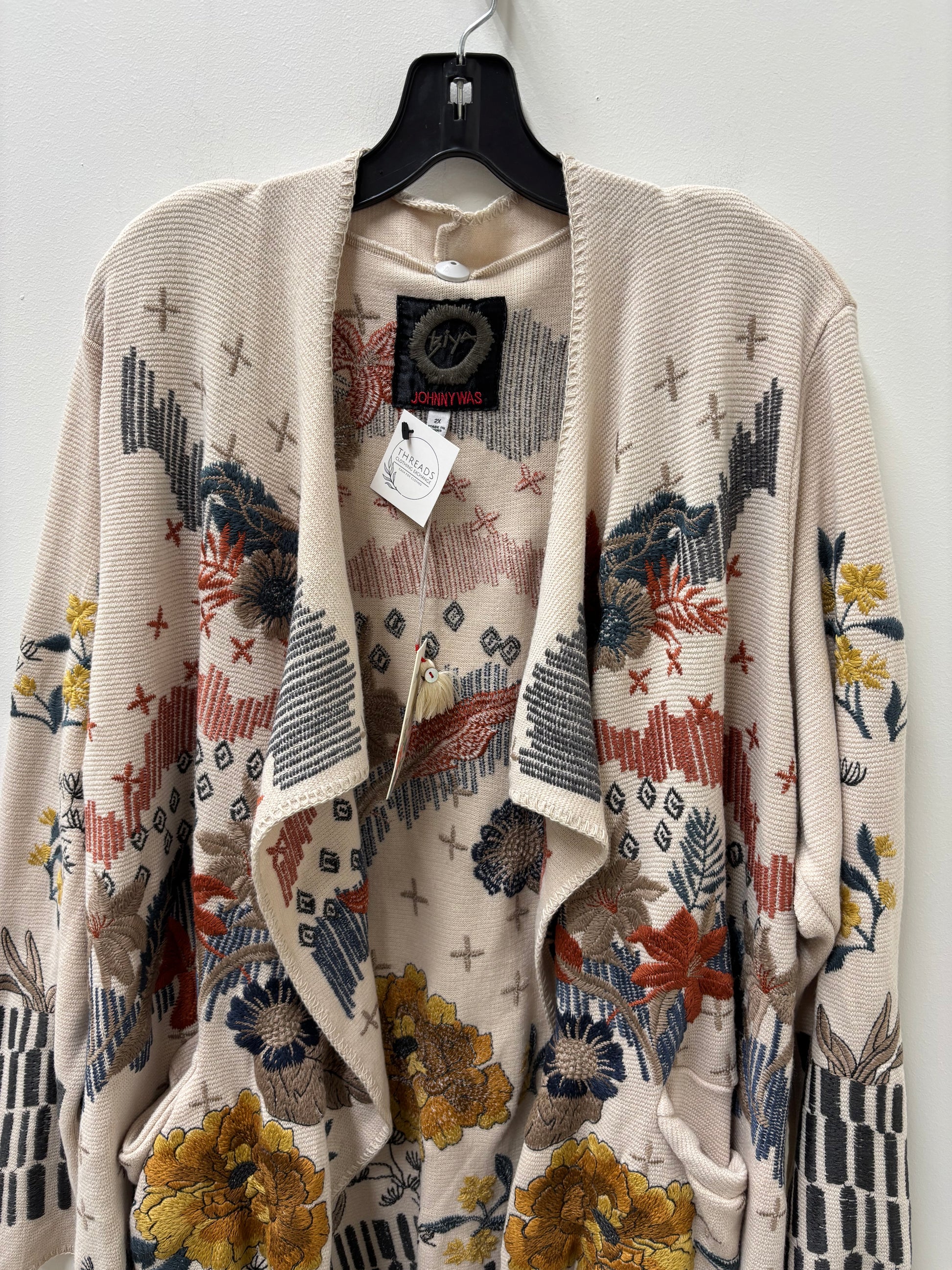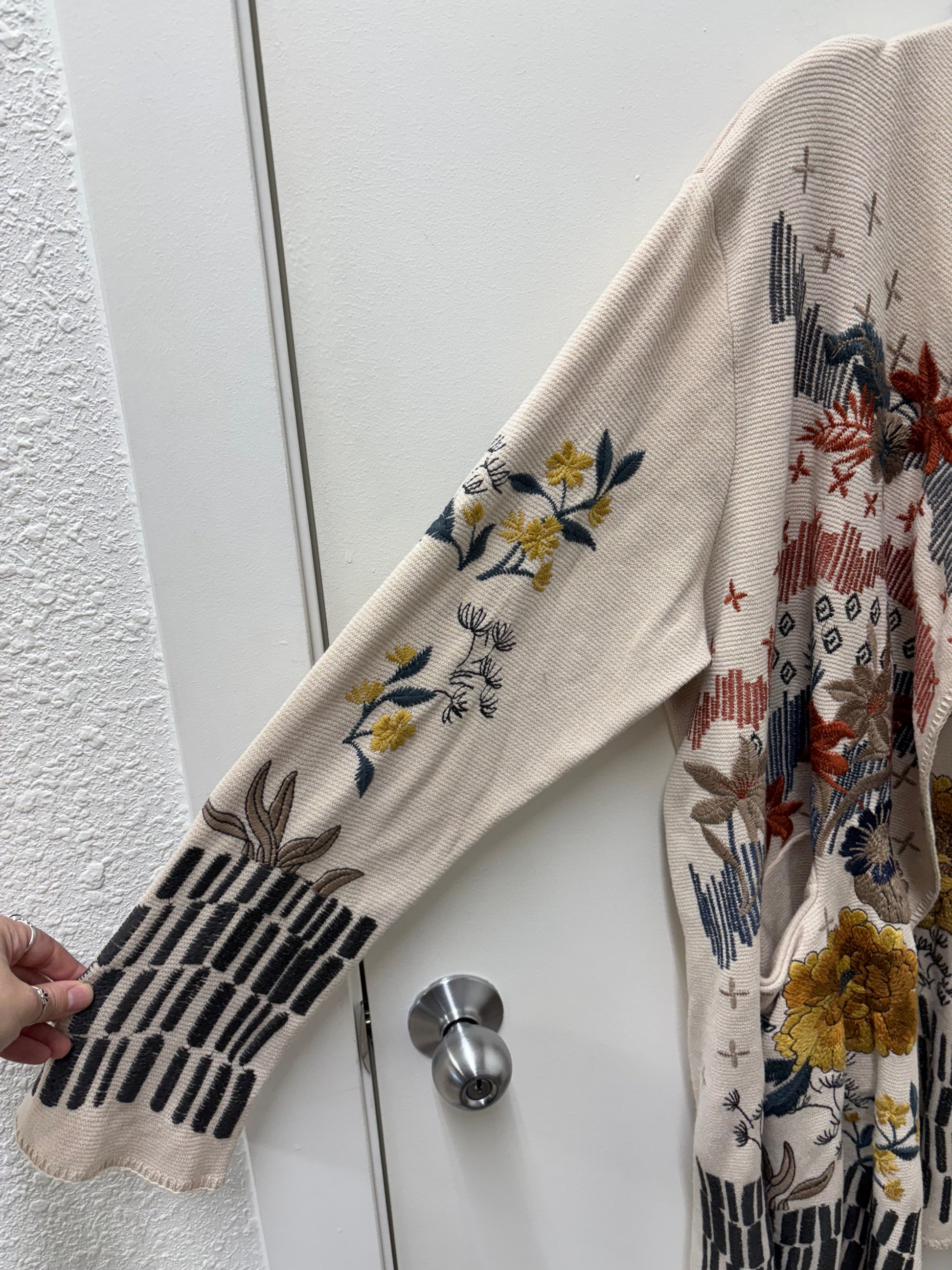 NWT. Length 35”. Sleeve length 19”. Cream Sarina wrap cardigan with vibrant floral embroidery. Perfect for layering and adding flair. Open front. Front slip pockets. Sold out on Johnnywas.com. Terylene, rayon, polyester. Perfect condition.