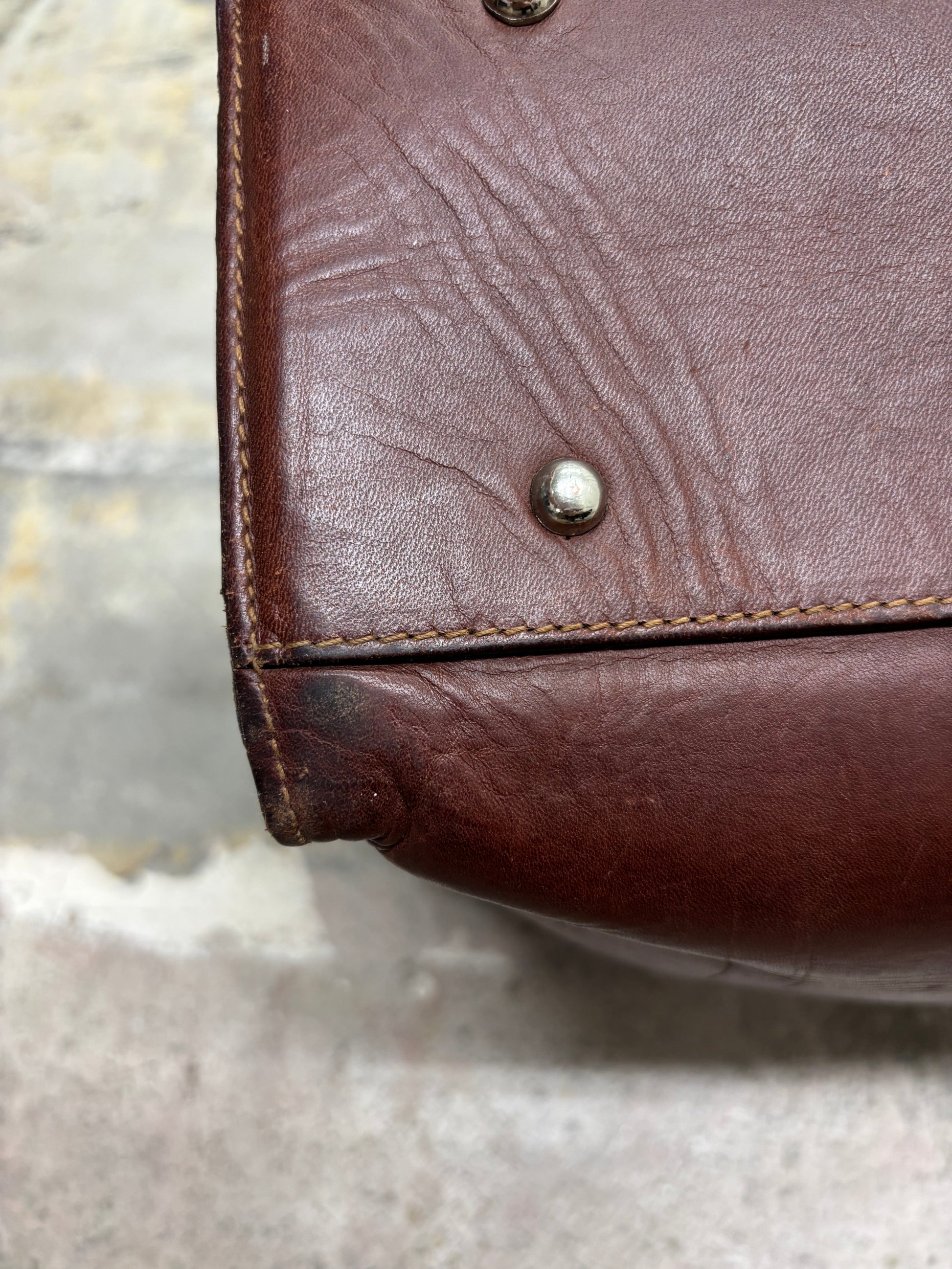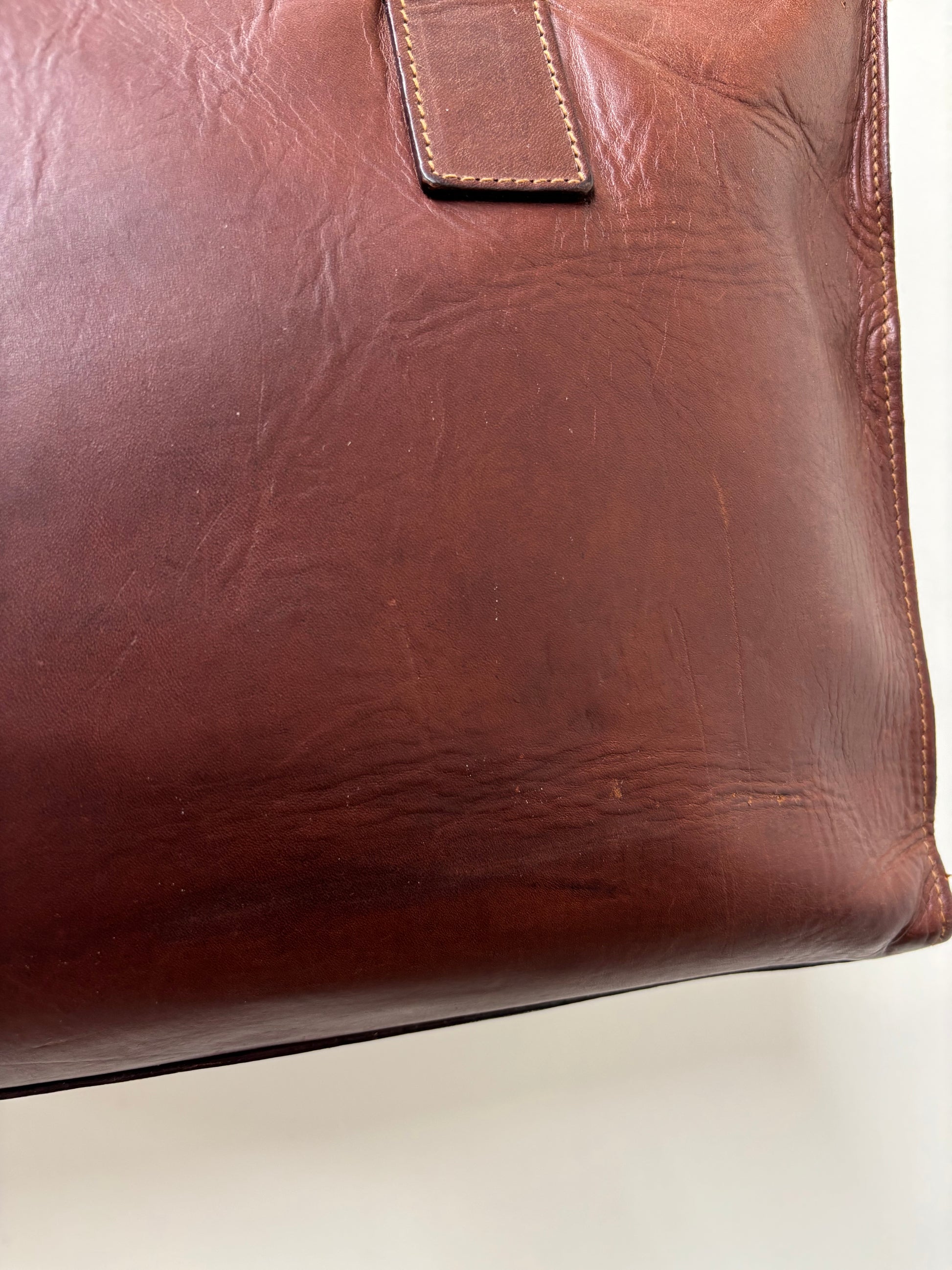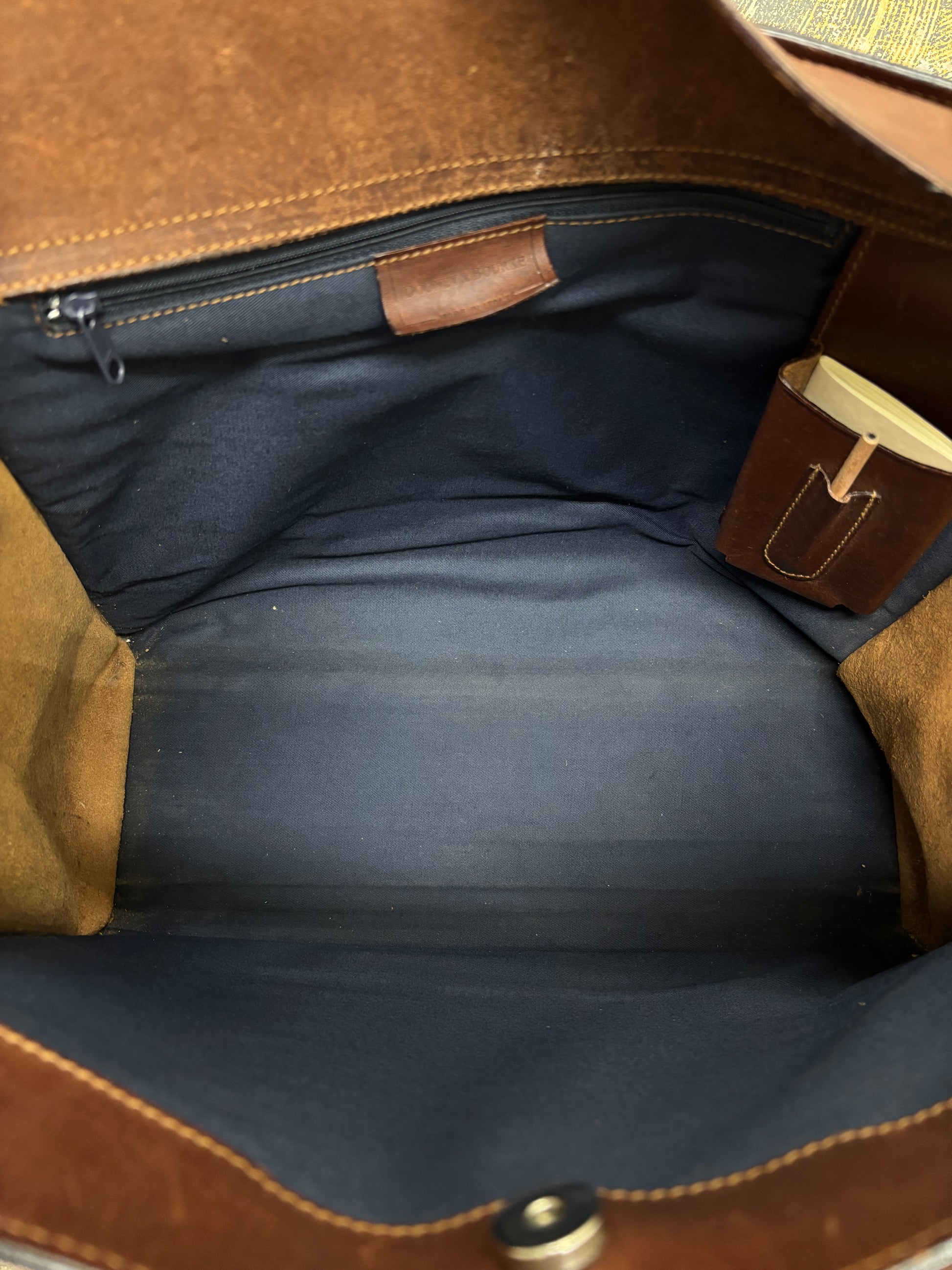 Vintage 1990s. Length 14.5”. Depth 10”. Width 5.5”. Elegant brown leather tote. Features sturdy handles and classic design. Dooney & Bourke tag. Flat base with four metal feet. Front slip pocket with magnetic closure. Flap with magnetic closure. Navy blue lining. Interior zip pocket. Never used address book & pencil with slip pockets for them. Perfect for professional use. Markings and wear, see photos. Made in Italy. Good vintage condition.
