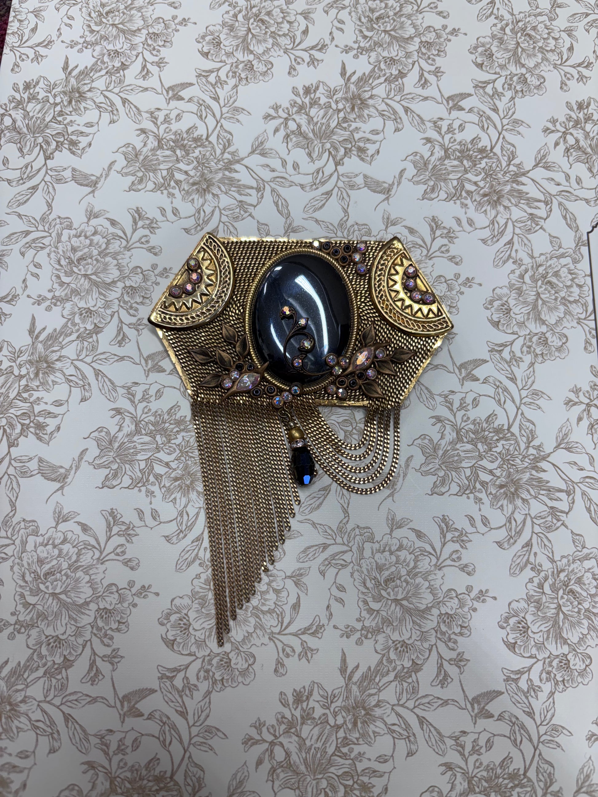 Length 3.5”. Height 2”. Vintage brooch/pendant features gold-tone and black cabochon crystal dangle. Chain fringe. Multi color jewels. Sun design. Hexagon shape. Pin and pendant loop on back. Handmade in Germany. Good vintage condition.